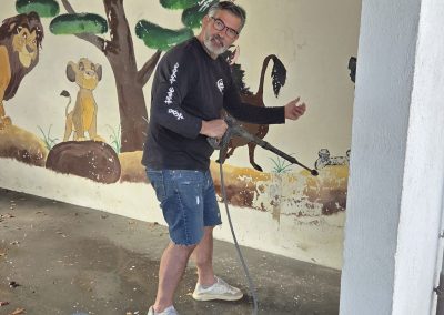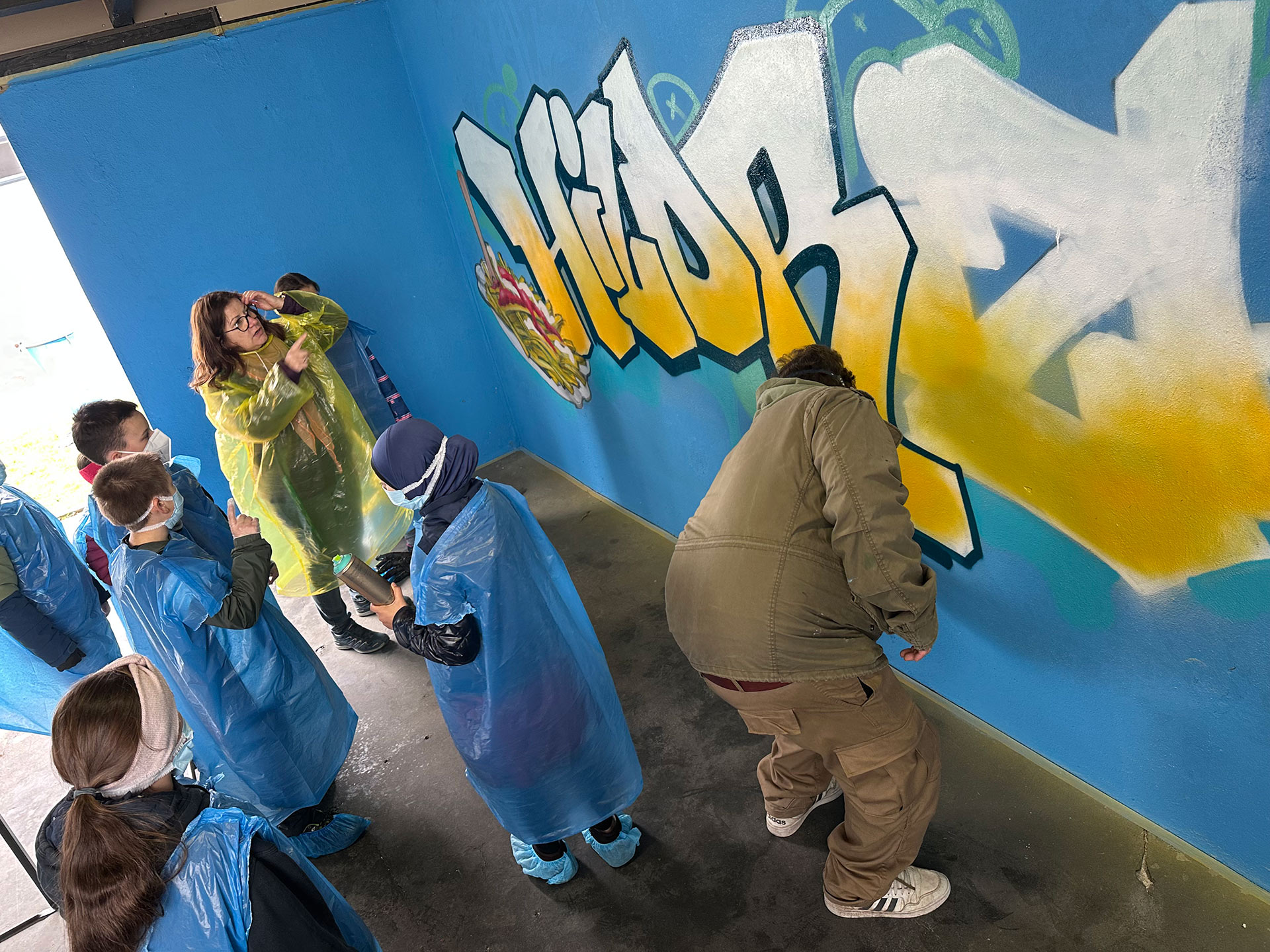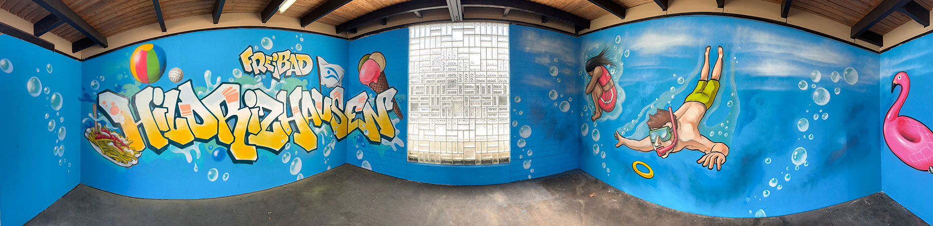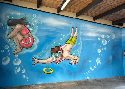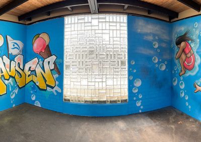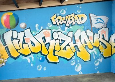 Aus einer Initiative des Freibad Fördervereins Hildrizhausen und des Schwimmmeisters Moritz Hillme hat Jugendreferent Martin Orendt ein tolles Projekt für die Viertklässler der Schönbuchschule entwickelt: Gemeinsam mit Maximilian Frank, einem professionellen Graffiti-Künstler, durften die Kinder die Wände eines Raums im Freibad gestalten. Gefördert wird das Projekt von Sicherer Landkreis e.V..