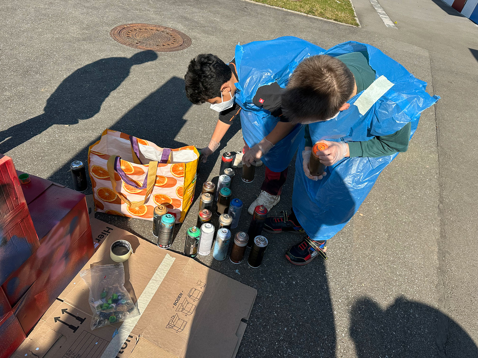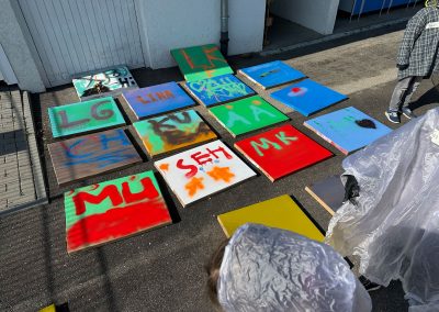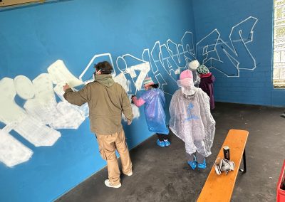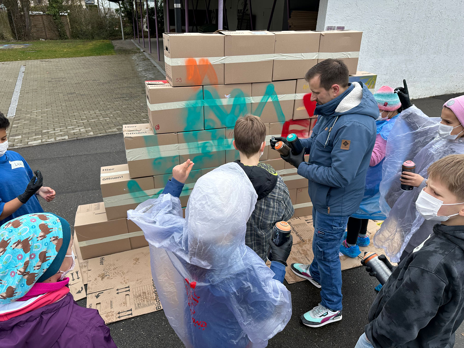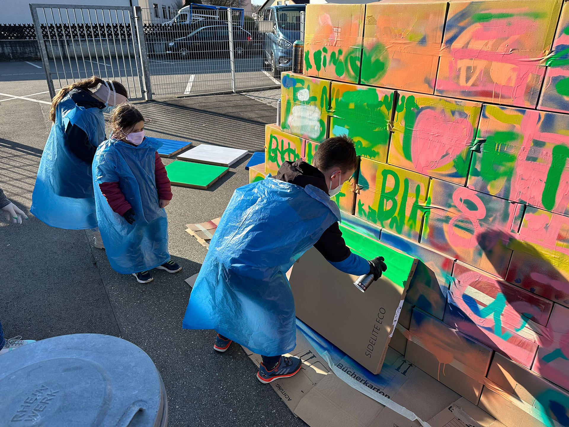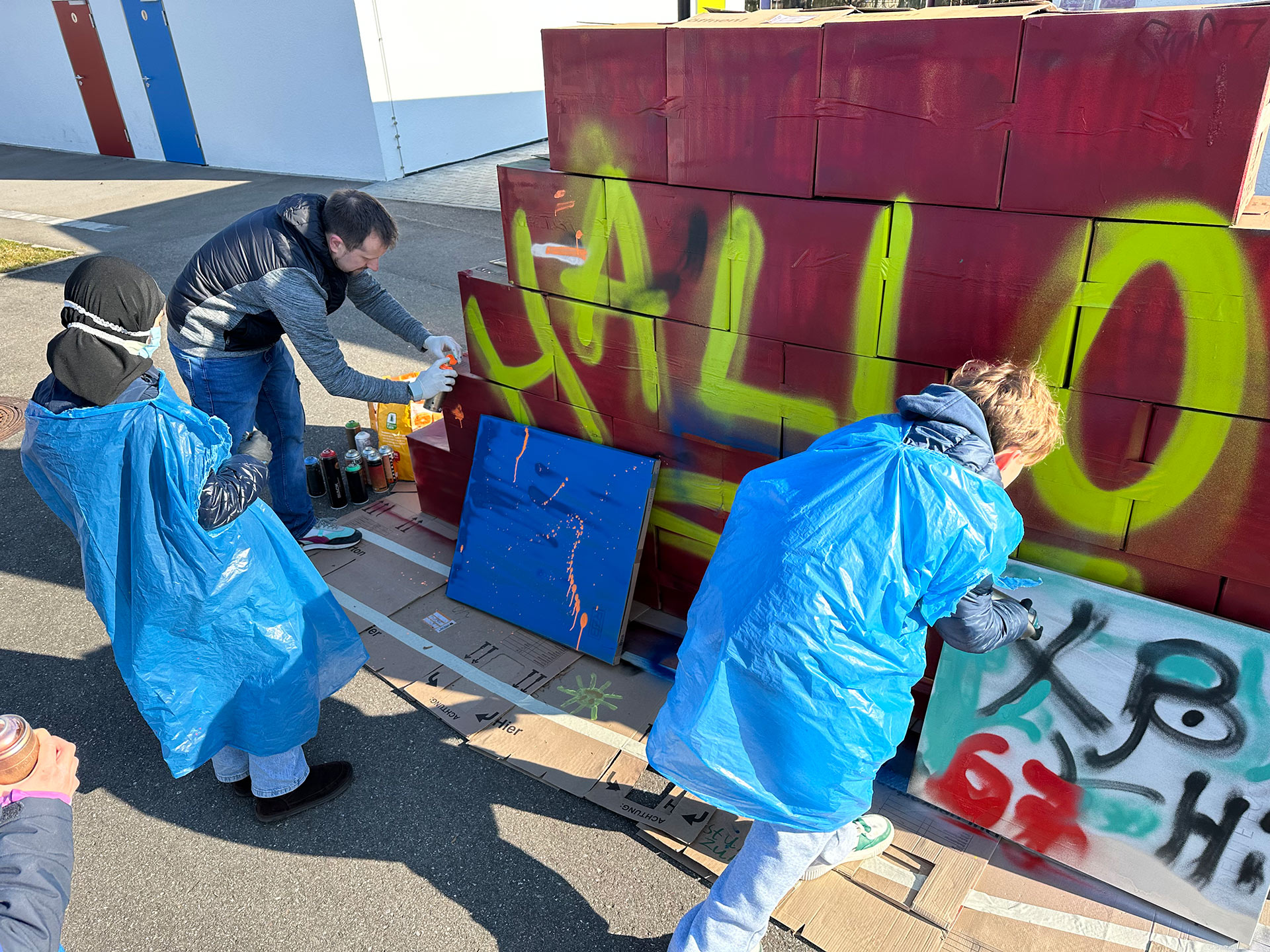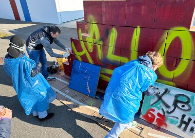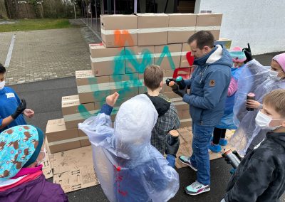 Nachdem Max erklärt hat, worauf es beim Sprayen ankommt, wie man ein Bild gestaltet und wie man die Dose richtig hält, ging es auch schon los. Außer dem raumfüllenden Bild, das die Kinder mitgestaltet haben, hatten sie auch Gelegenheit, sich auf einer Wand aus Pappkartons mit eigenen Motiven auszuprobieren.