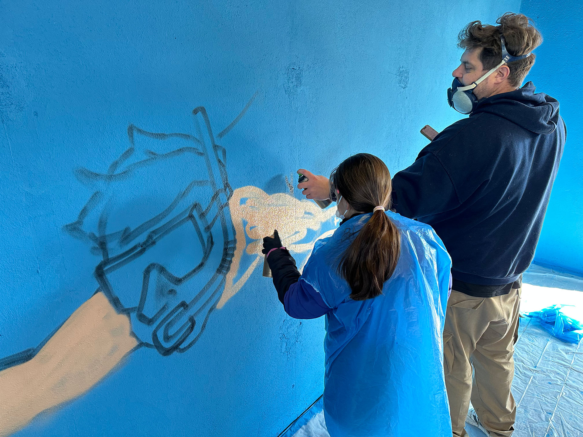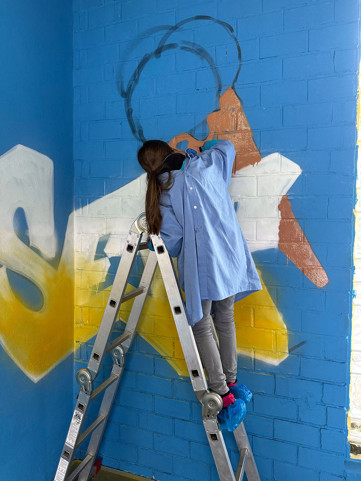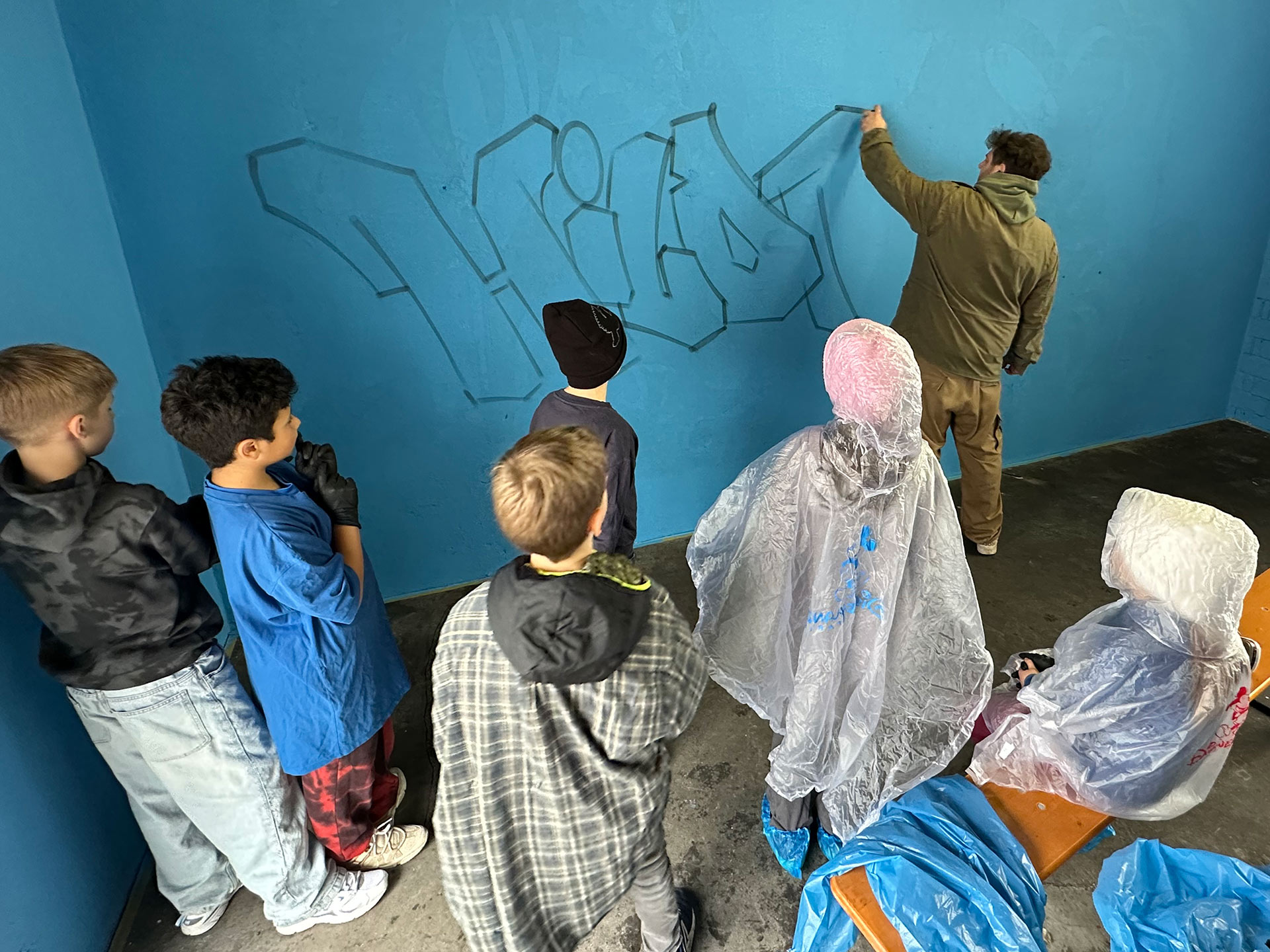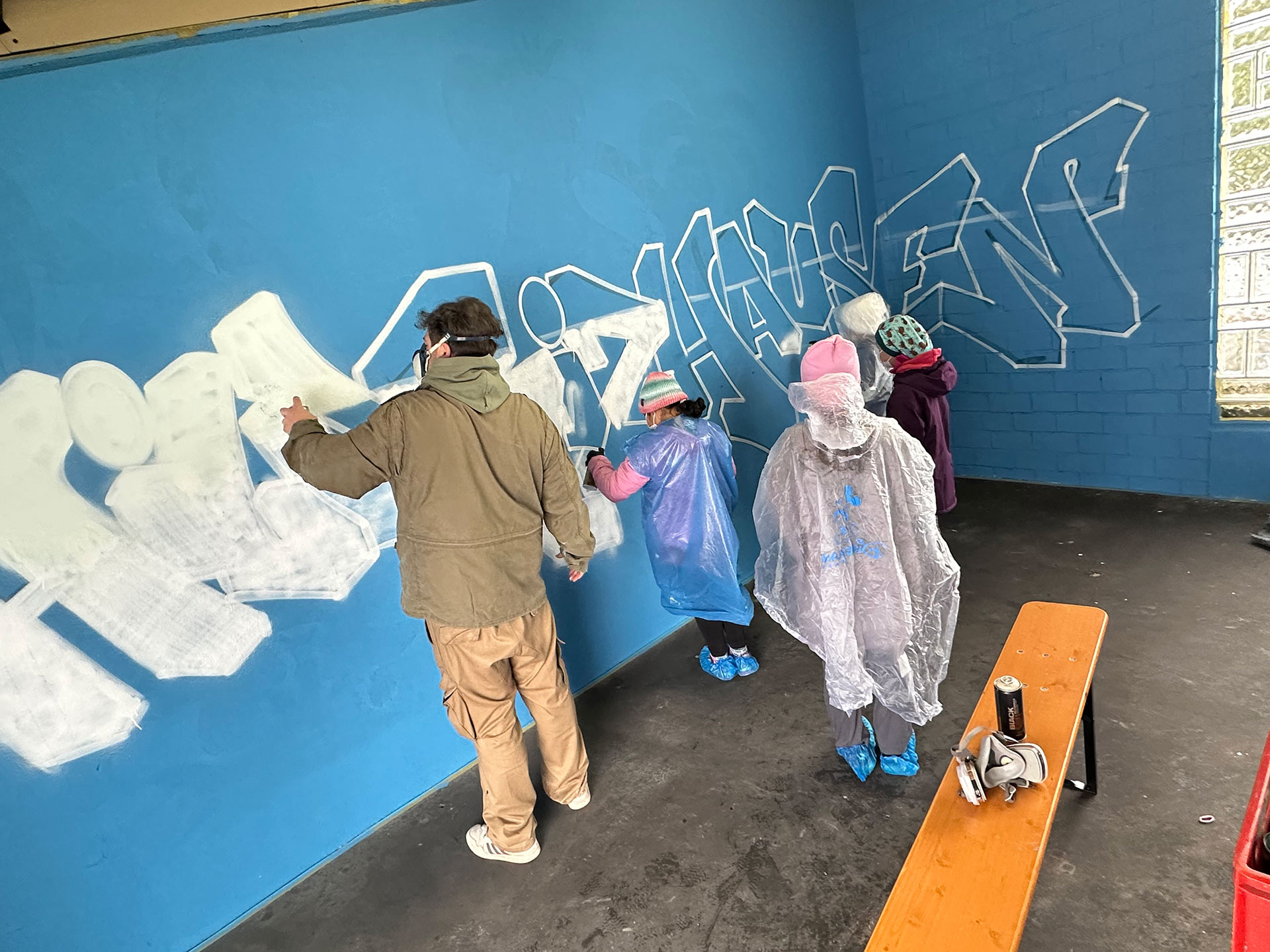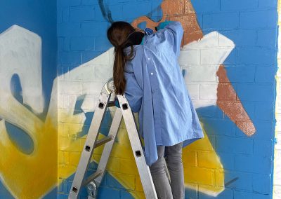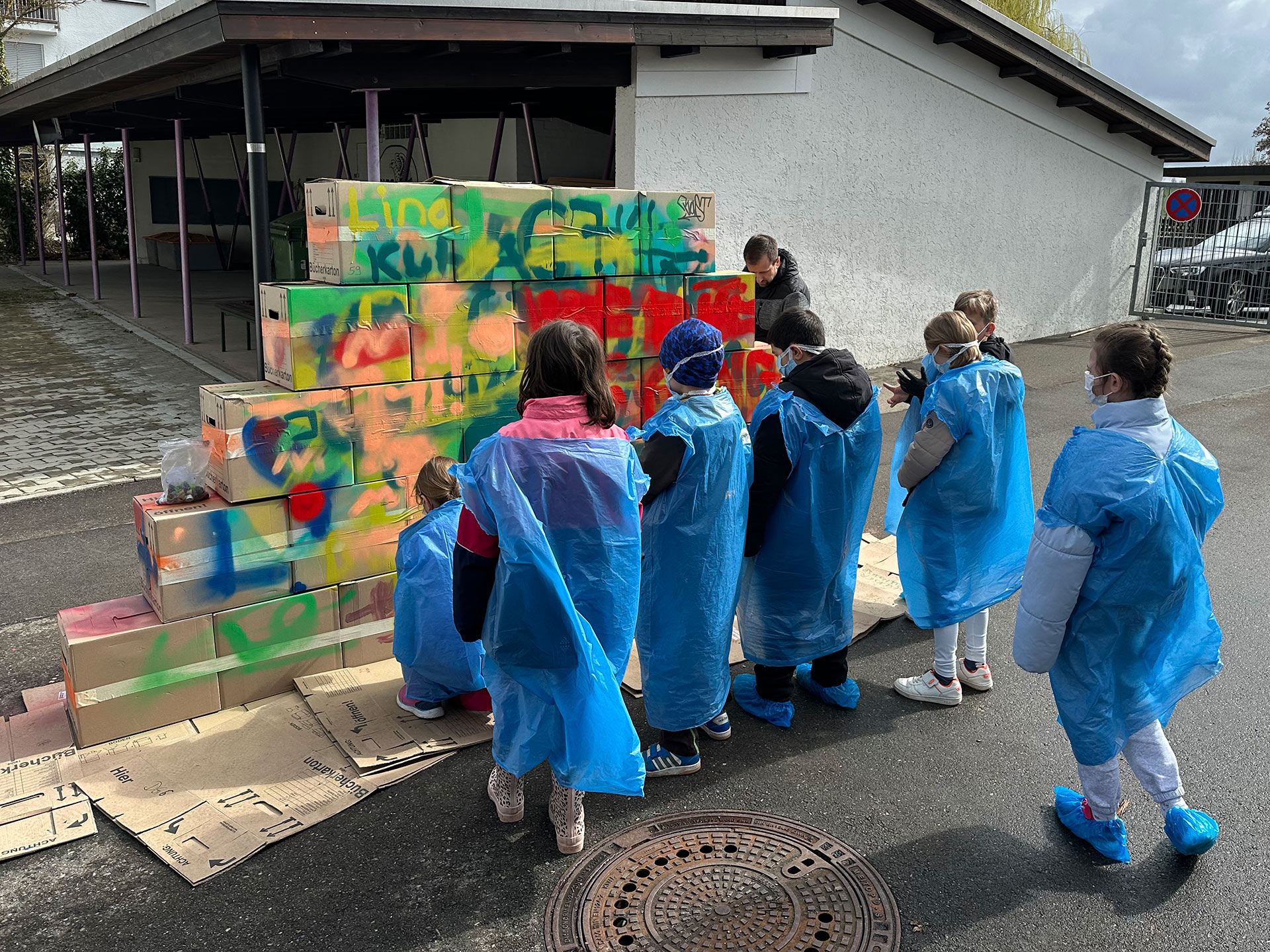 Nachdem Max erklärt hat, worauf es beim Sprayen ankommt, wie man ein Bild gestaltet und wie man die Dose richtig hält, ging es auch schon los. Außer dem raumfüllenden Bild, das die Kinder mitgestaltet haben, hatten sie auch Gelegenheit, sich auf einer Wand aus Pappkartons mit eigenen Motiven auszuprobieren.